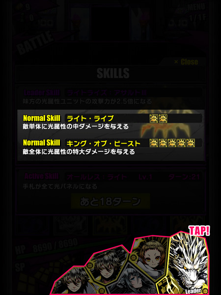 スキルは、クエスト中いつでもユニットをタッチすることで確認することができます。